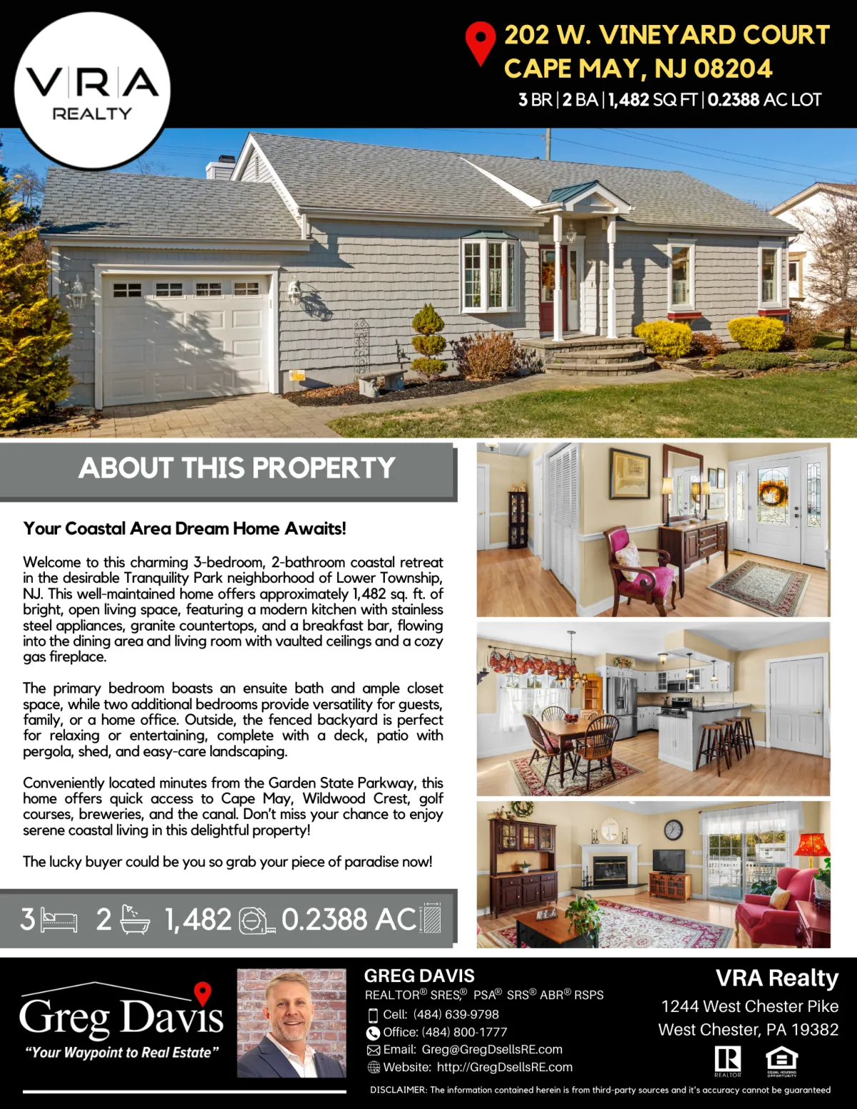 Welcome to this inviting 3-bedroom, 2-bathroom coastal retreat, nestled in the highly desirable Tranquility Park neighborhood of Lower Township, NJ. This meticulously maintained residence offers approximately 1,482 square feet of thoughtfully designed living space in a peaceful and serene setting.